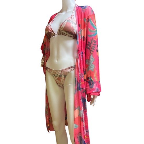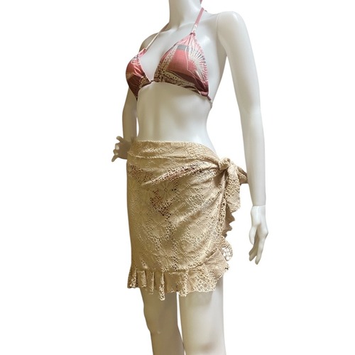 南米ブラジルから届いた、一点もののアートビキニ。星の砂をモチーフにしたデザインは、どこか懐かしさと優雅さを同時に演出。くすみピンクを基調に、絶妙に調和したベージュとグレーが、大人の女性らしい落ち着きを引き立てます。リゾート地やプールサイドで目を引くこと間違いなしのスタイルです!