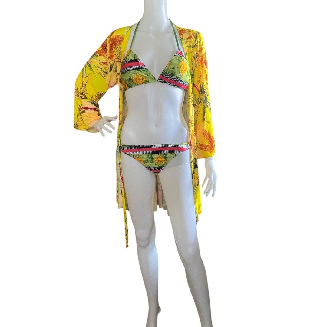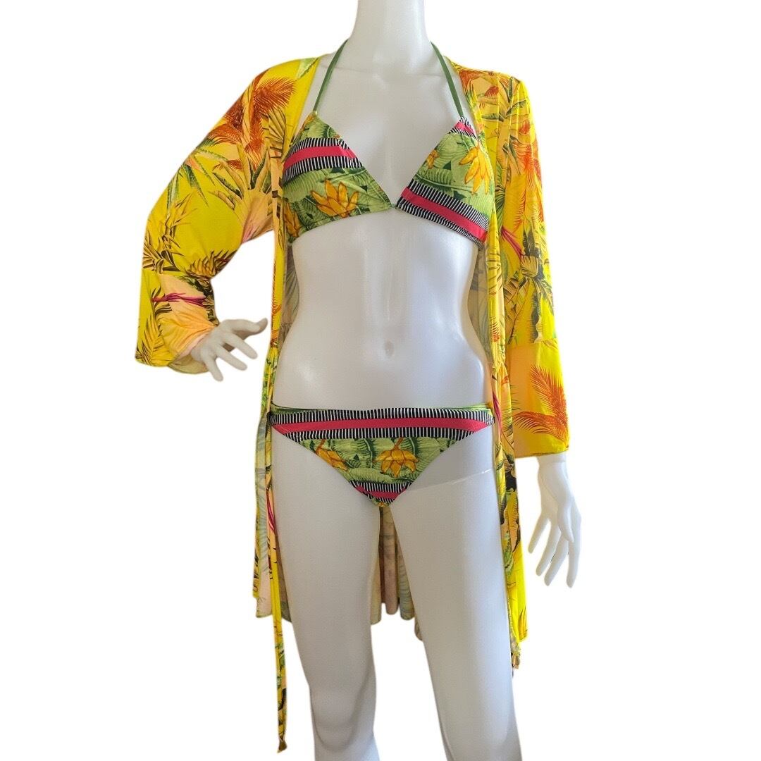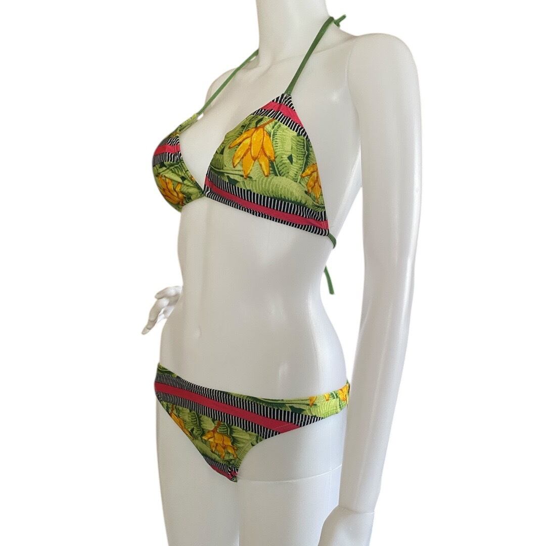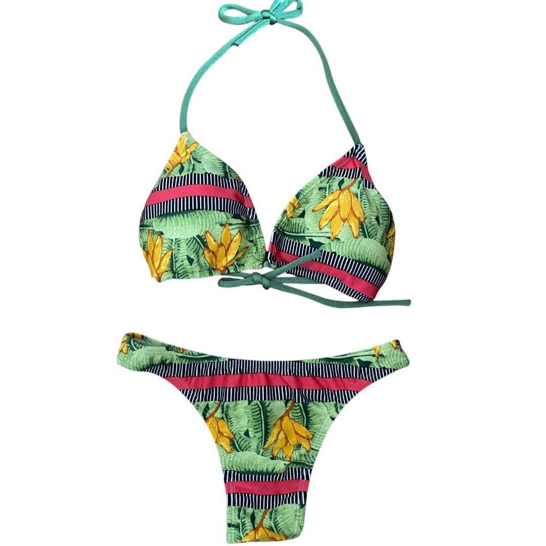 鮮やかな黄バナナの花とジャングルグリーンの葉が印象的なデザイン。黒×白のストライプにレッドラインがアクセントとなり、洗練されたブラジリアンモードを演出します。遊び心とスタイルが共存する1着。