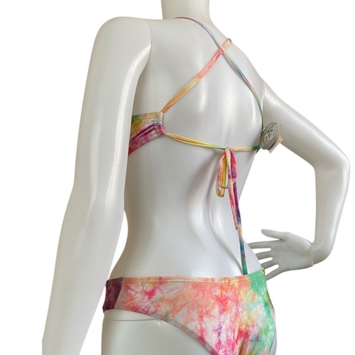 水彩画のようなにじみ感が魅力の、マルチカラータイダイ柄ビキニ。ピンク、ブルー、イエロー、グリーンなどカラフルながら柔らかい色合いが、夏の陽射しに映えるアイキャッチなデザインです。