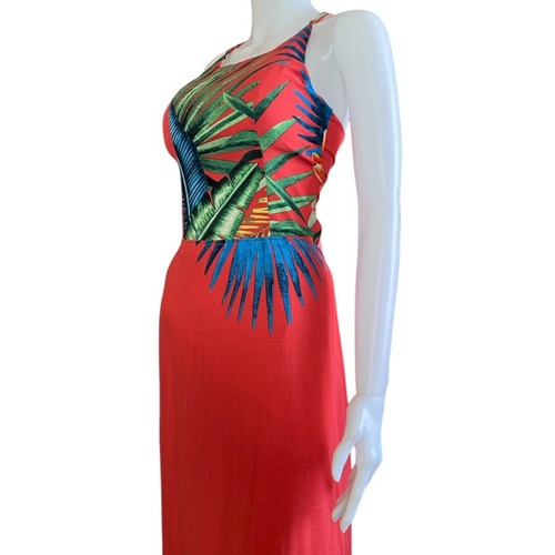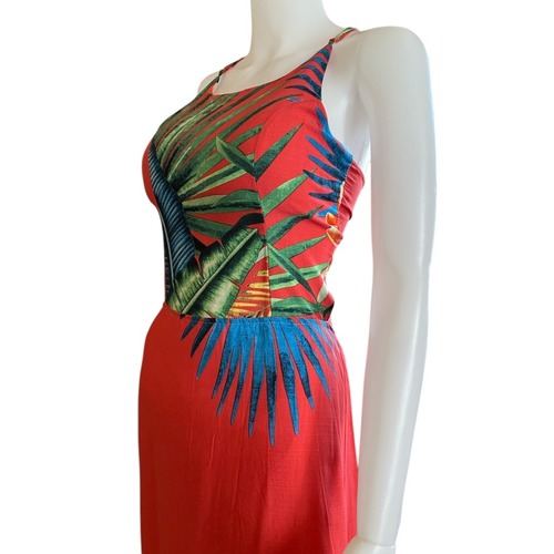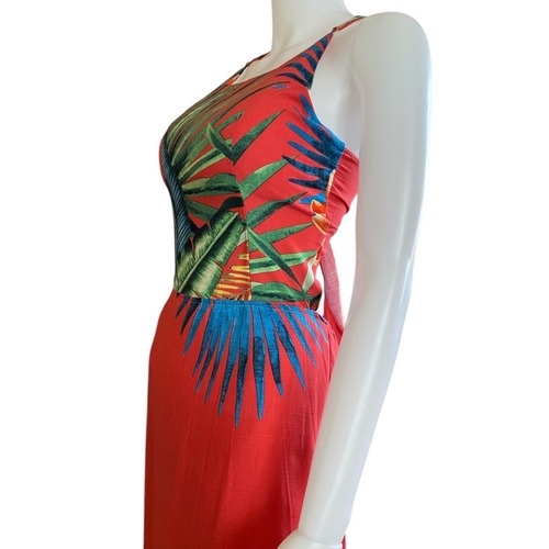 ビビッドな赤をベースに、ブルーやオレンジの南国植物が大胆にデザインされた一枚です。